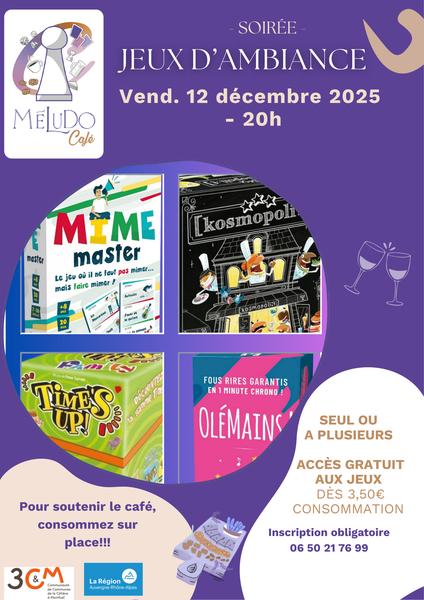 Soirée jeux d'ambiance, seul ou à plusieurs. Au programme: Mîmes master, kosmopolit, time's up, olé mains et bien d'autres jeux... Réservation...