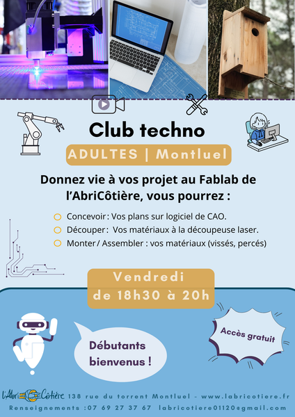 Le vendredi 24 avril 2026 de 18h30 à 20hInitiation / découverte dans le cadre d'un événementClub techno (Adultes) à l’AbriCôtière