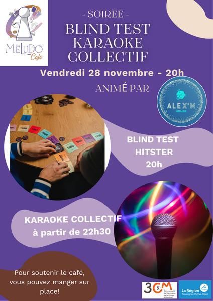 Le vendredi 28 novembre 2025 à 20hKaraokéSoirée jeux Blind test et Karaoké collectif