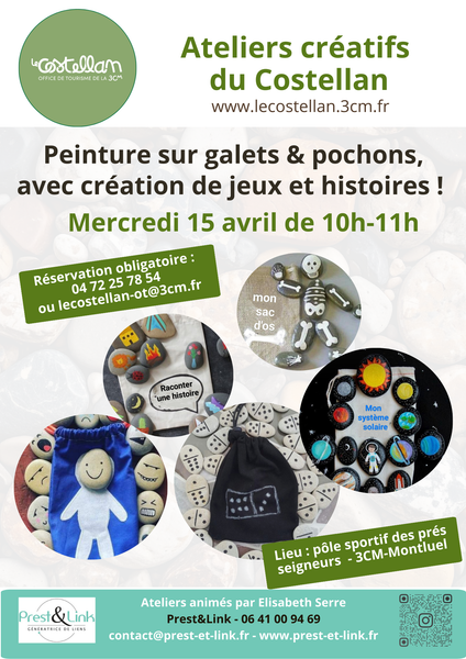 Le mercredi 15 avril 2026 de 10h à 11hInitiation / découverte dans le cadre d'un événementLes bricolages artistiques du Costellan : Peinture sur galets et pochons avec créations de jeu et histoires