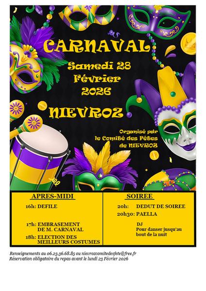 Venez assister au Carnaval organisé par le Comité des Fêtes de Niévroz. Défilé dès 16h. Soirée dansante accompagnée d'une excellente paella suivie...