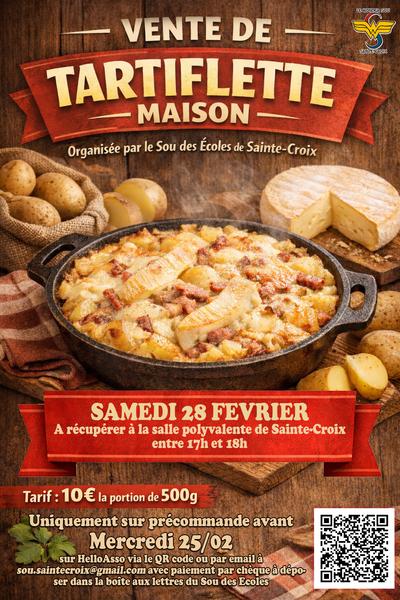 Le samedi 28 février 2026 de 17h à 18hVente à emporterTartiflette maison à emporter (par le sou des écoles de Sainte-Croix)