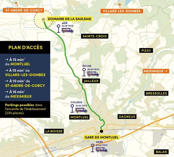 Des navettes TICO seront mises à votre disposition gratuitement toutes les 15 minutes de 18h30 à 23h30, effectuant le trajet Montluel - MFR. La dépose s'effectuera dans l'enceinte de la MFR au début du parcours.