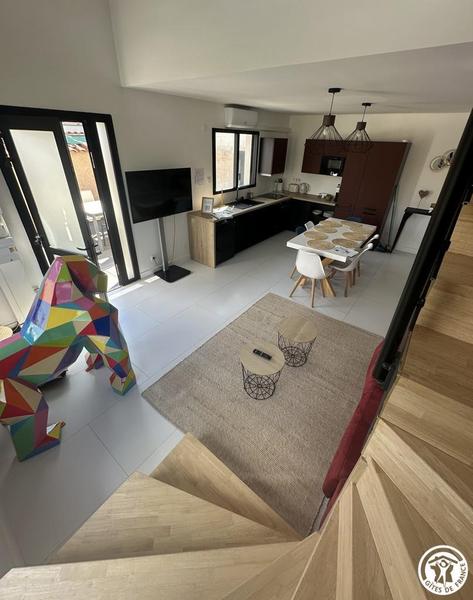 Rez-de-chaussée : cuisine équipée et ouverte sur l'espace repas et salon. Une chambre (1*160*200) avec salle d'eau-WC.